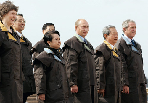 I read with some interest the Times article Obama Says Forum’s Costume Photo Is Unnecessary. This refers to the tradition of the 21 members of the annual APEC (Asia-Pacific Economic Cooperation) forum participating in what has unfortunately been dubbed “the silly shirts photo.” Past photo-ops “have included ponchos and what looked like gowns for pregnant bridesmaids,” Jackie Calmes wrote. Frankly, I’m surprised by Calmes’ snarkiness.